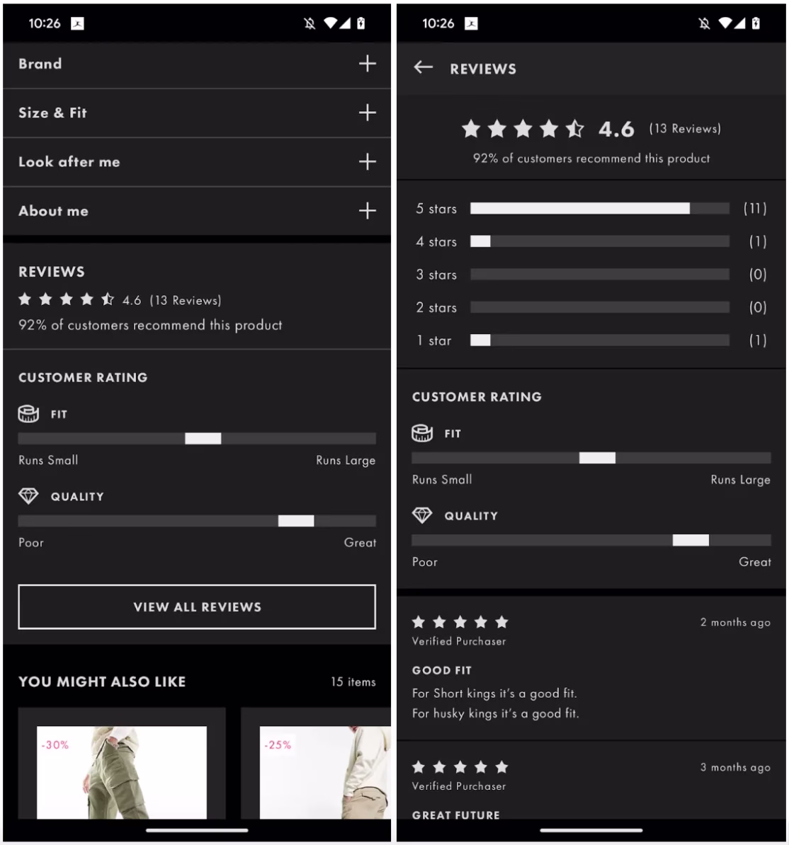 Take a leaf out of ASOS’s book and make it easy for them by jumping those who tap on the star rating down to a user review section, with the option of expanding to read reviews in detail.