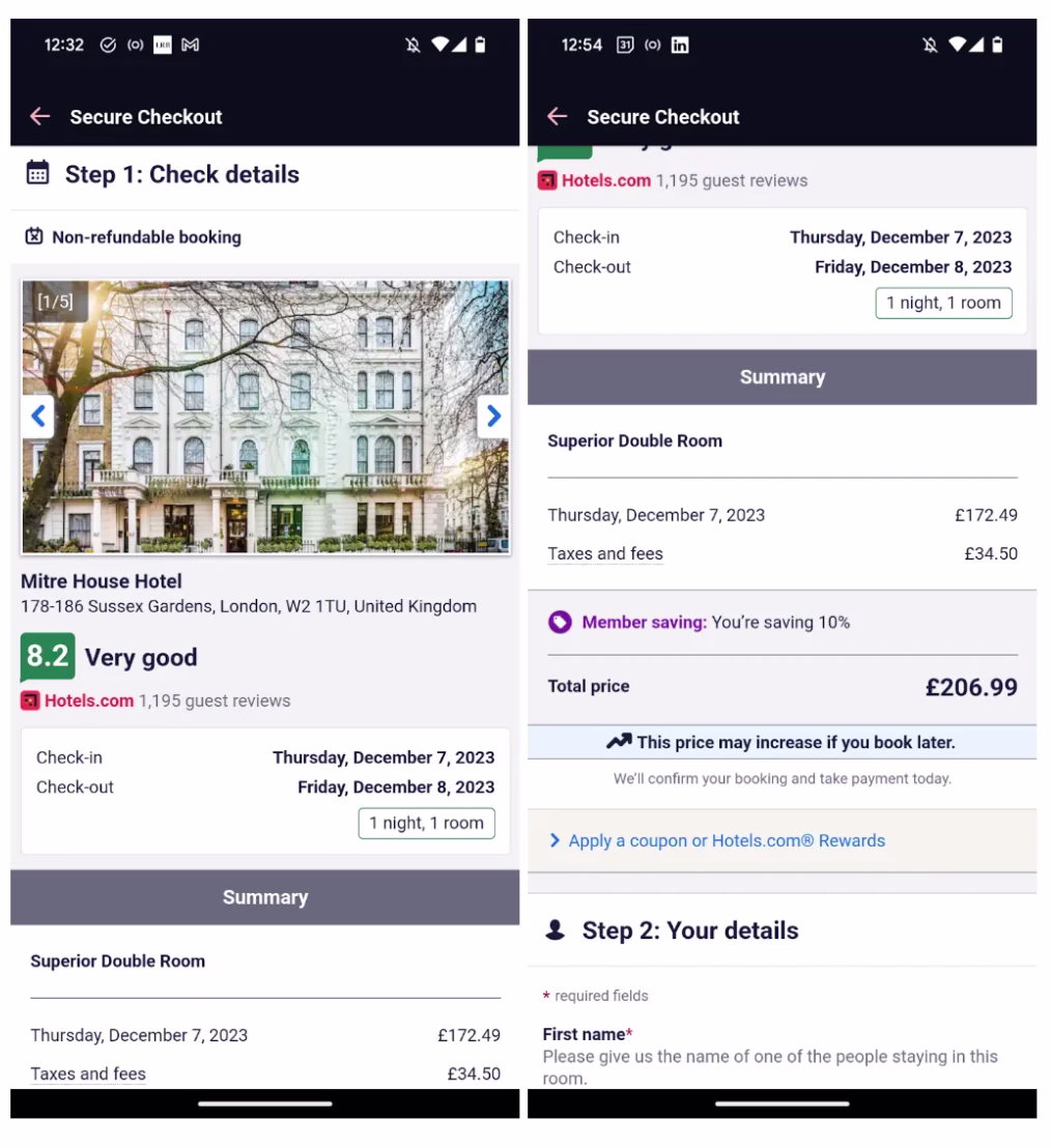The Hotels.com app has an effective checkout screen—although there is arguably some room for improvement.