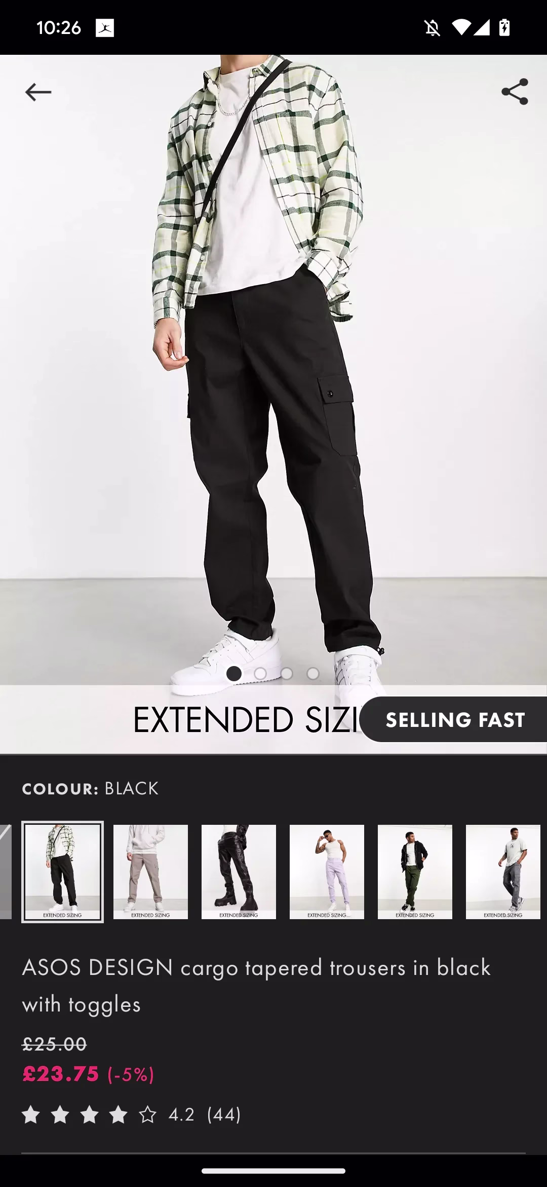 Firstly, that little “selling fast” label subtly emphasizes how popular these cargo pants are and makes users feel they have to act fast to secure themselves a pair.