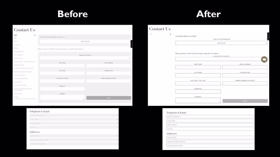 Hotel Chocolat's 'Contact Us' form before (left) and after (right) optimization