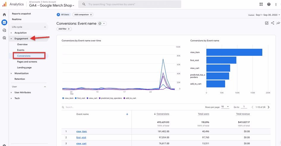 Navigate to Reports > Life cycle > Engagement > Conversions to view the conversion event overview report.